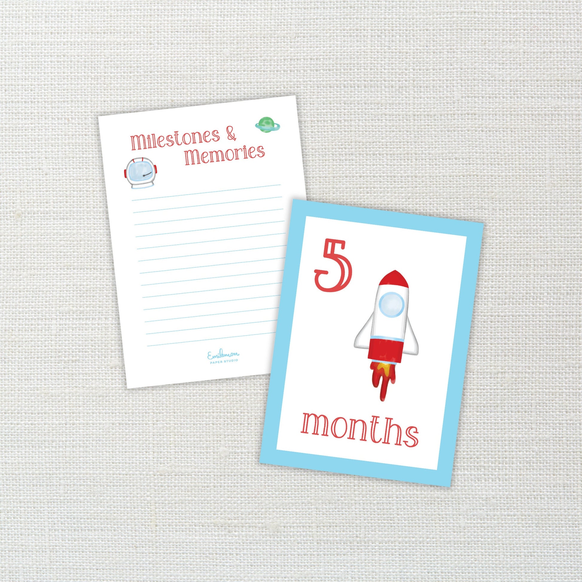 Baby milestone cards are sized 5x7 and printed on thick, 120 lb eggshell cardstock. They arrive packaged in a gift box for easy gifting.