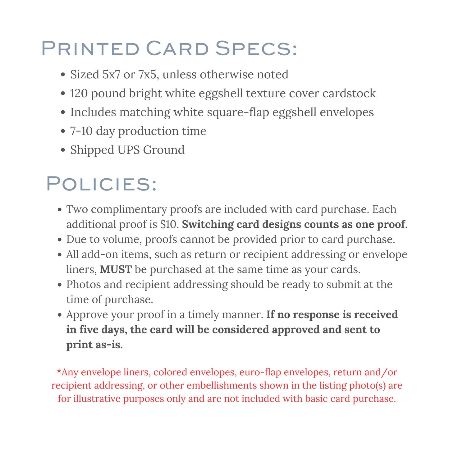 This Christmas card is sized 5x7, and printed on thick 120 lb eggshell cover cardstock. Cards come with matching white square-flap envelopes. If you would like any extras such as envelope liners or return/recipient addressing, please contact me to purchase the additional listing for those upgrades.